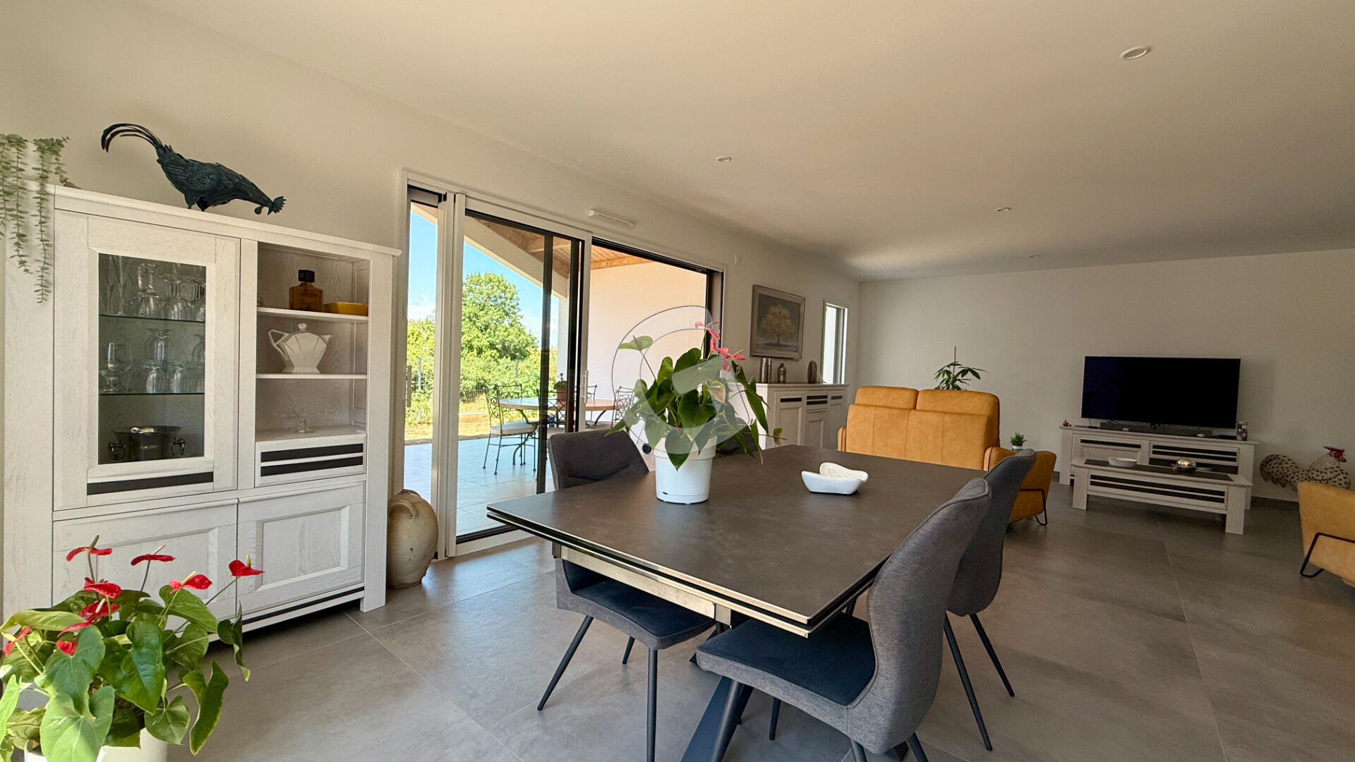 Elle comprend une entrée avec placard, un grand séjour lumineux avec cuisine ouverte aménagée et équipée, trois chambres, une salle d'eau avec wc, un deuxième WC séparé, ainsi qu'un cellier et un grand garage carrelé.
