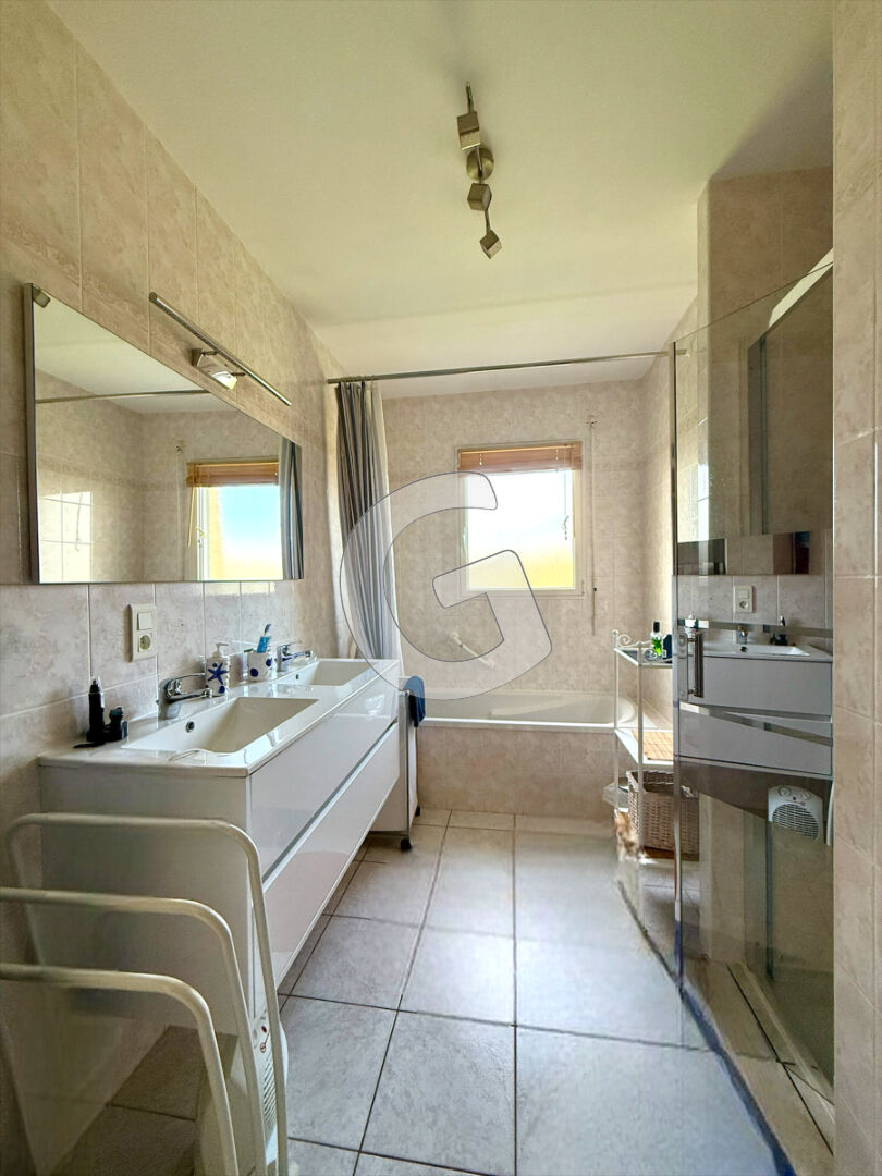 une entrée avec placard, un séjour salon avec cuisine ouverte et aménagée, un couloir desservant la salle de bains et les deux chambres avec placard, une salle d'eau vaste avec double vasques, une douche et une baignoire, un WC, un cellier communiquant à la cuisine et le garage.
